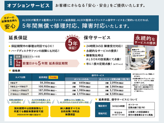 ALSOKでは、設置目的、運用方法、監視場所、予算に加え、自然環境、カメラに対する心理的な効果を配慮するなど様々な条件やニーズに合わせた、効率的で死角の少ないカメラ配置、撮影した膨大な映像データの保存や、事件・事故が発生した際の警察機関への映像記録の提出などの運用する方が効率的に活用できるシステムをご提案しています。