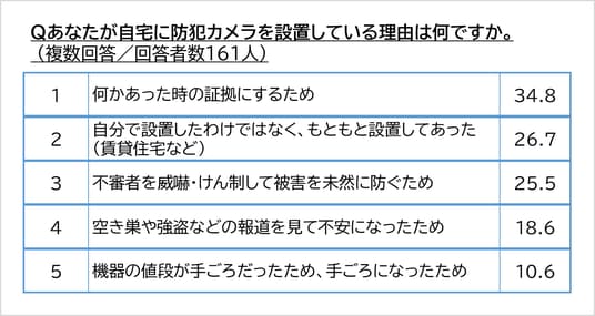 防犯カメラを設置している理由を尋ねたところ、「何かあったときの証拠にするため」(34.8%)が最も多く、「被害を未然に防ぐため」(25.5%)、「報道を見て不安になったため」(18.6%)と続きました。