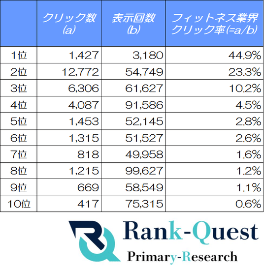 https://rank-quest.jp/column/column/how-to-seo/ SEO対策支援実績4300社のランクエストがフィットネス業界における検索順位毎のクリック率を徹底解説!