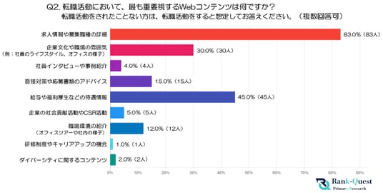 - 次いで「給与や福利厚生などの待遇情報」(45.0%)が高く、安定性や生活基盤を重視する意識がうかがえます。