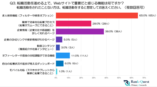 - 最も多かったのは「求人検索機能(フィルターや検索オプション)」(65.0%)で、希望条件に合った求人を効率的に探せる点が最も重視されていることが分かります。