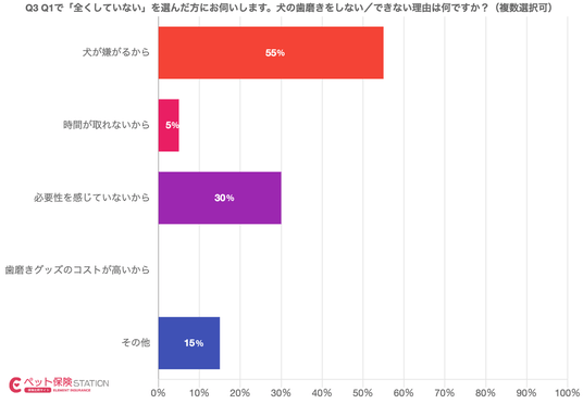 最多は「犬が嫌がる」で55%、次いで「必要性を感じない」30%、「その他」15%、「時間が取れない」5%だった。