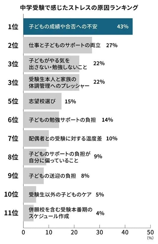 この数字からは、中学受験が子どもにとって大事な挑戦の機会であると同時に、保護者にとってはストレスマネジメントが不可欠なイベントであることがわかります。