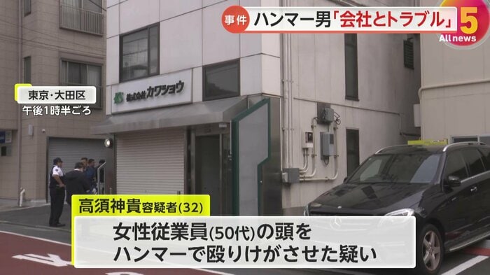 高須神貴(たかす・こうき)容疑者(32)は5日午後、東京・大田区の会社事務所で、50代の女性従業員の頭をハンマーで殴りけがをさせた疑いがもたれている。