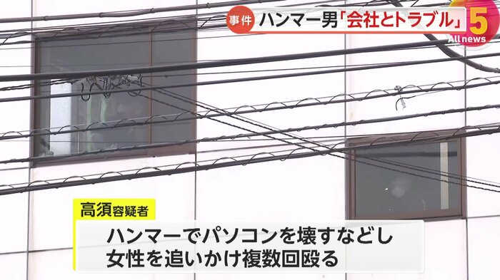警視庁によると、高須容疑者は3階の事務所内でハンマーでパソコンを壊すなどした後、女性を追いかけ回し複数回殴ったということだ。