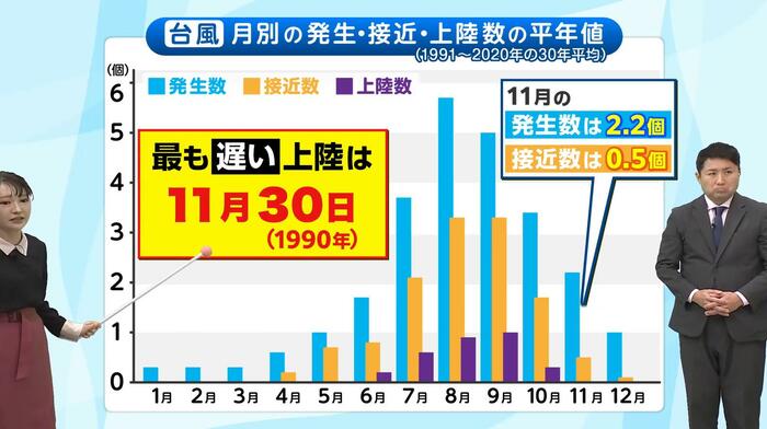 問題は、発生した台風が日本に接近、あるいは上陸するかどうかです。月別の台風の「発生数」「接近数」「上陸数」の平年値を表したグラフを見ると、11月の「発生数」は平均2.2個。「接近数」も0.5個、「上陸数」はゼロと、可能性は、ほぼないと言えますが、過去最も遅い台風の上陸記録は、1990年の11月30日(和歌山県)だったそうです。