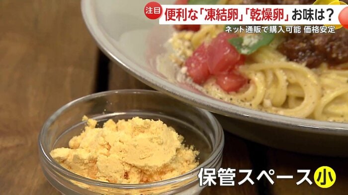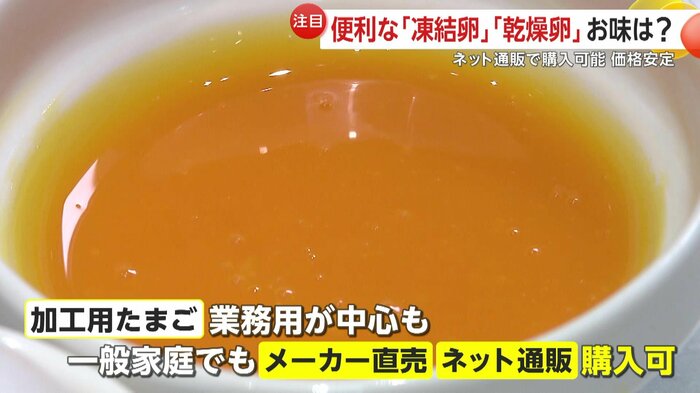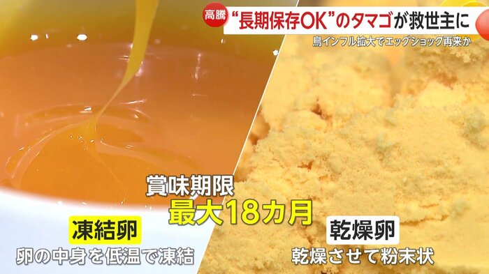 卵の中身を低温で凍らせた「凍結卵」や粉末状にした「乾燥卵」は、賞味期限が最大で18カ月と長期保存が可能となっている。
