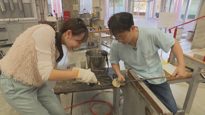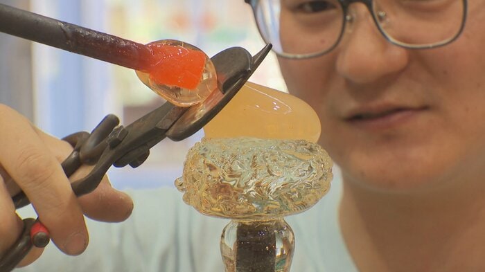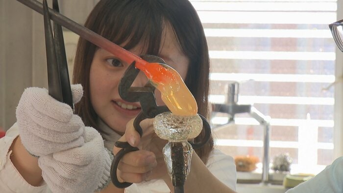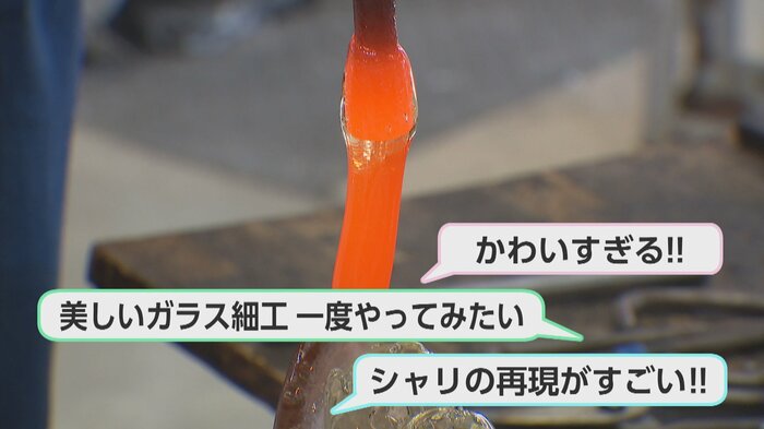 体験はまず約1300度の溶解炉から透明なガラスを取り出し、シャリの形に整えるところから始まる。ごはん粒の表現には溶けたガラスに小さなガラス粒をつける工夫が施されている。