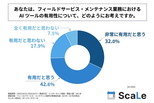 フィールドサービス・メンテナンス業界の現場担当者の約75%が、業務でのAIツール活用を「有用」と考えている