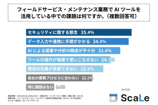 次に、フィールドサービス・メンテナンス業務において、AIツールを活用していると回答した人を対象に「フィールドサービス・メンテナンス業務でAIツールを活用している中での課題」を尋ねる設問への回答では、1位が「セキュリティに関する懸念」で35.4%、2位が「データ入力や連携に手間がかかる」で34.4%、3位が「AIによる提案や分析の精度が不十分」で31.6%という結果になりました。この結果から、フィールドサービス・メンテナンス業務において、AIツールを活用している人が、AIツールを活用する中で課題と感じていることは、主に「セキュリティに関する懸念」や「データ入力や連携の手間」であることがわかりました。