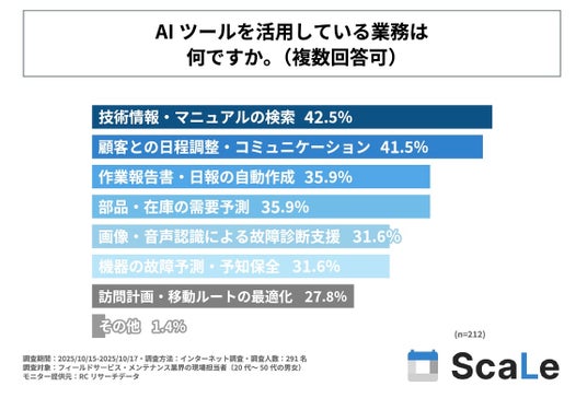 続いて、フィールドサービス・メンテナンス業務において、AIツールを活用している(時々活用している、日常的に活用している)と回答した人を対象に「AIツールを活用している業務」を尋ねる設問への回答では、1位が「技術情報・マニュアルの検索」で42.5%、2位が「顧客との日程調整・コミュニケーション」で41.5%、3位が同率で「作業報告書・日報の自動作成」と「部品・在庫の需要予測」で35.9%という結果になりました。この結果から、フィールドサービス・メンテナンス業務においてAIツールを活用している人が、AIツールを活用している業務は、主に「技術情報・マニュアルの検索」や「顧客との日程調整・コミュニケーション」であることが判明しました。