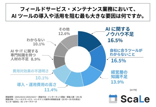 調査の最後、フィールドサービス・メンテナンス業務において、AIツールを活用していないと回答した人を対象に「フィールドサービス・メンテナンス業務において、AIツールの導入や活用を阻む最も大きな要因」を尋ねる設問への回答では、1位が同率で「AIに関するノウハウ不足」と「自社に合うツールがわからないこと」で16.5%、3位が「経営層の知識不足」で13.9%という結果になりました。この結果から、フィールドサービス・メンテナンス業務においてAIツールを活用していない人が考える、AIツールの導入や活用を阻む最も大きな要因は「AIに関するノウハウ不足」と「自社に合うツールがわからないこと」であることが明らかになりました。