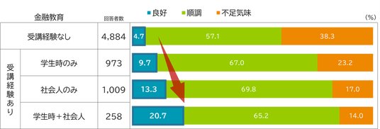 ● 金融教育の受講時期によっても金融リテラシー度に差はあり、学生時代と社会人の両方で受講経験のある人は金融リテラシー度が良好な割合が最も高い