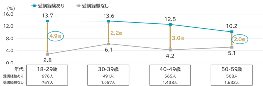 また、金融教育の受講経験の有無によって金融リテラシー度「良好」層の割合を比較すると、すべての年代で「受講経験あり」の方が2倍以上高い結果となりました(図表7)。特に20代では4.9倍と最も大きな差があり、教育の効果が若年層において顕著であることがわかります。一方、50代では2.0倍と差が小さく、年長層では経験や自己学習によってリテラシーが育まれている可能性も示唆されます。
