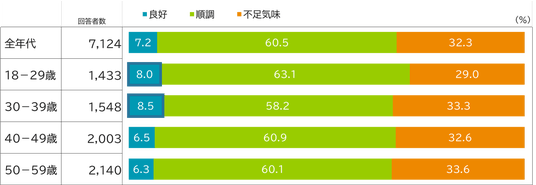 勤労者全体の金融リテラシー度は、「良好」7.2%、「順調」60.5%、「不足気味」32.3%という結果となりました。特に20代・30代では「良好」の割合がそれぞれ8.0%、8.5%と、全体平均よりもやや高い傾向が見られ、若年層において金融リテラシー度の向上が進んでいる兆しがうかがえます。今後の章では、この金融リテラシー度によってどのような行動や意識の違いがあるのかを詳しく見ていきます。