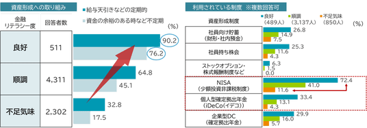 勤労者で金融リテラシー度が高い層は、資産形成に対して積極的な姿勢を示しており、定期的な積立を行っている割合が高い傾向にあります。(図表2)の左図を見ると、金融リテラシー度「良好」層では、給与天引きなどで定期的に積立を行っている人の割合が9割を超えています。