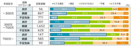 ● 同じ年収帯であっても、金融リテラシー度が良好な層は、報酬水準への満足度が高い傾向