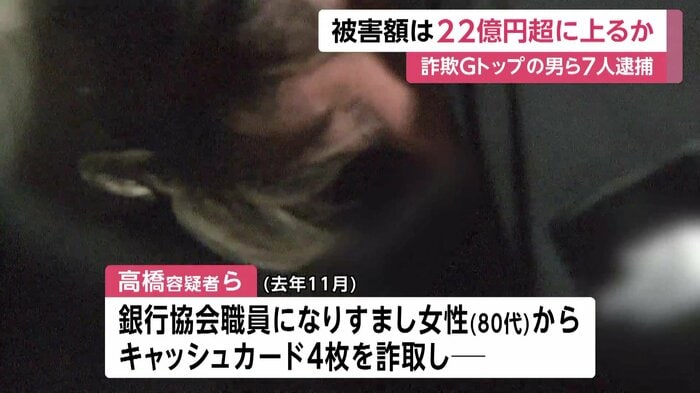 高橋宗正容疑者ら7人は2024年11月、銀行協会の職員になりすまし、埼玉県に住む80代の女性からキャッシュカード4枚をだまし取り、現金400万円を引き出した疑いなどがもたれている。