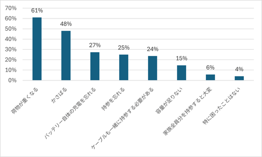 Q:旅行時のモバイルバッテリー持参で困った経験は(複数回答)