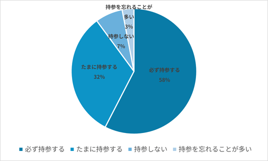 「持参する」(必ず+たまに)= 90%(約9割)、これは次問で「負担に感じている」が53%だったことと合わせると、「負担に感じながらも9割が持参する」という強い矛盾が浮き彫りになりました。