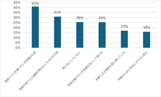 約74%が何らかの充電不安を抱えている(「特に気にしていない」が26%)。バッテリーを持参していても、7割以上が充電切れの不安や、それにより行動が制限されるといった課題を抱えながら旅行していることが分かりました。