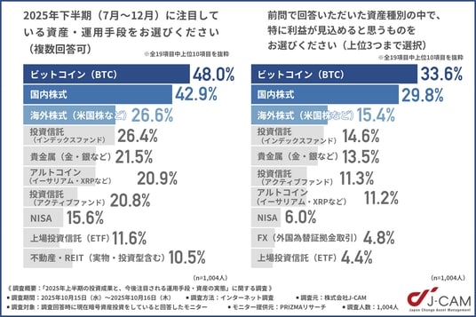 2025年下半期に注目されている資産・運用手段は、「ビットコイン」と「国内株式」が拮抗し、暗号資産と株式を重視する傾向がみられました。
