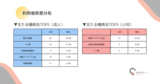 【利用者疾患分布】成人「統合失調症(30.0%)」・小児「自閉スペクトラム症(42.2%)」が最多