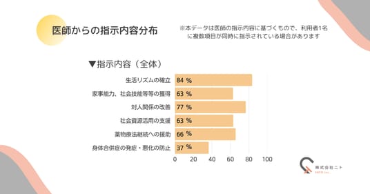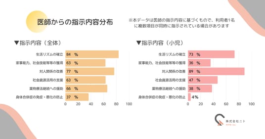 利用者への医師からの指示内容においては、全年齢対象としては「生活リズムの確立」が最も多く85.3%となりました。次点では、「対人関係の改善」が76.7%となっています。
