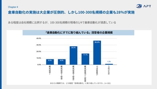 レポート内一例:倉庫自動化の実施は大企業が圧倒的、しかし100-300名規模の企業も28%が実施