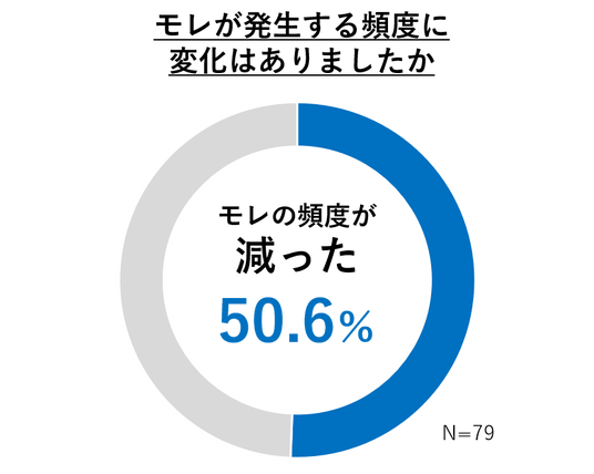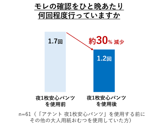 使用者の50.6%が「モレが発生する頻度が減った」と回答。また、睡眠中にモレが発生していないかを確認する回数は、使用前のひと晩、平均「1.7回」から、使用後は平均「1.2回」と約30%減少したことが明らかになりました。