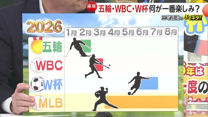 来年の日程を見てみると、2月のオリンピック開幕に始まり、3月にはWBC、そして、3月後半にはメジャーリーグも開幕します。さらに、6月からはワールドカップも1カ月以上開催されます。