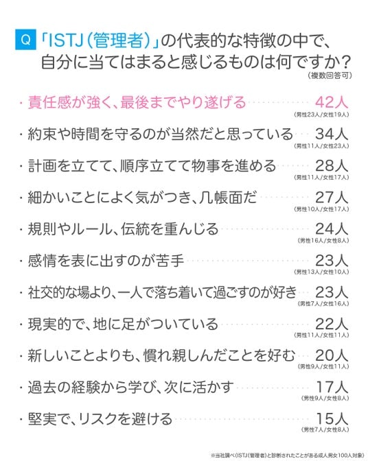 ここからは、より詳しくISTJ(管理者)について調査するために、先ほどのアンケートとは別に、「ISTJ(管理者)と診断された経験のある成人男女100人」を対象に実施したアンケート結果を紹介します。