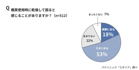 また、「暖房使用時に乾燥して困ると感じることがありますか?」という質問については、「頻繁にある」(18%)、「たまにある」(53%)と71%が「ある」と回答。湿度が下がると体感温度も下がるため、乾燥は寒さの原因の一つにもなります。