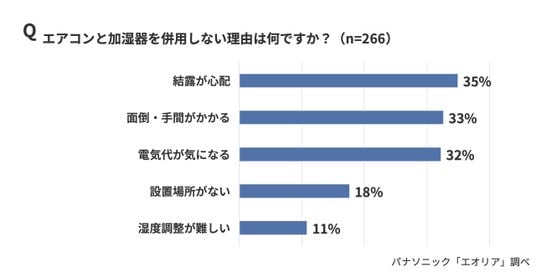 ・エアコンと加湿器を併用しない理由、「結露が心配」(35%)、「面倒・手間がかかる」(33%)、「電気代が気になる」(32%)が上位に