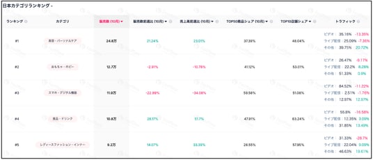 販売店舗の取り扱い商品における「販売実績のある商品点数」は(-30%)、新商品数(-72%)の指標から推測すると、TikTok Shop全体における店舗の販売商品の供給における課題可能性も考えられます。