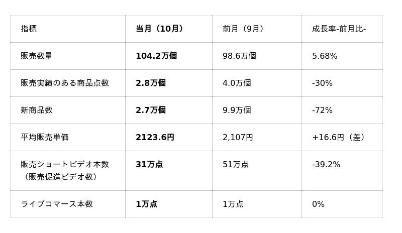 市場全体では引き続き「ビデオ(カゴ付ショートビデオ)」が販売主戦場となっているものの、10月でライブ配信数量が前月比44%と大きく増加へ。
