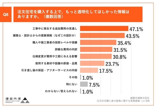 「Q6.注文住宅を購入する上で、もっと透明化してほしかった情報はありますか。(複数回答)」(n=308)と質問したところ、「工事中に発生する追加費用の見通し」が47.1%、「建築士・設計士からの提案根拠(なぜこの設計か)」が43.5%、「職人や施工業者の技術レベルや実績」が35.4%という回答となりました。
