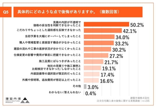 Q4で「ある」と回答した方に、「Q5.具体的にどのような点で後悔がありますか。(複数回答)」(n=235)と質問したところ、「見積の内訳が不透明で価格の妥当性を判断できなかったこと」が50.2%、「こだわりやちょっとした違和感を反映できなかった」が42.1%、「当初予算を大幅にオーバーしてしまったこと」が34.0%という回答となりました。