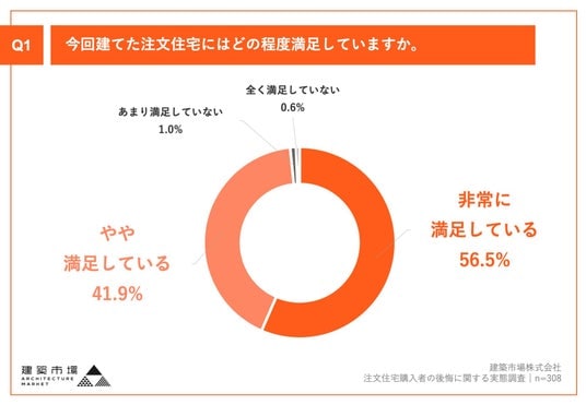 「Q1.今回建てた注文住宅にはどの程度満足していますか。」(n=308)と質問したところ、「非常に満足している」が56.5%、「やや満足している」が41.9%という回答となりました。