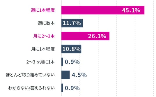 ■回答者の71.2%が、週に1本もしくは月に2~3本のコンテンツを制作。回答者の71.2%が、週に1本もしくは月に2~3本のコンテンツを制作。