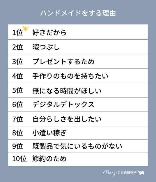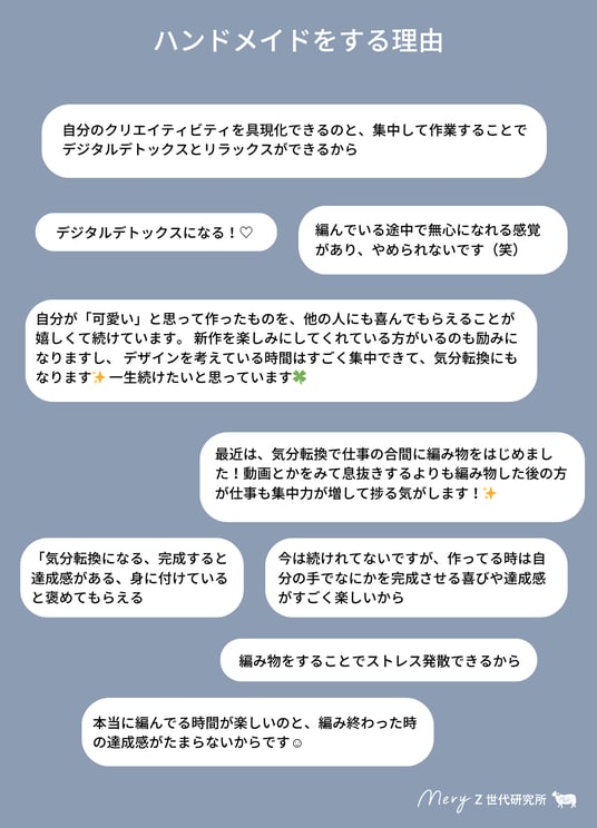 続いて、「ハンドメイドをする理由」について伺ったところ、5位に「無になる時間がほしい」、6位に「デジタルデトックス」が入り、コメントでも「達成感がある」、「デジタルデトックスになる」「集中力が増す」といったコメントが見られた。
