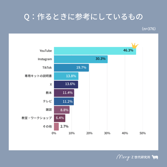 また、「作るときに参考にしているもの」では1位「YouTube」(46.3%)、2位「Instagram」(30.3%)、3位「TikTok」(19.7%)とSNSがTOP3を占めた。