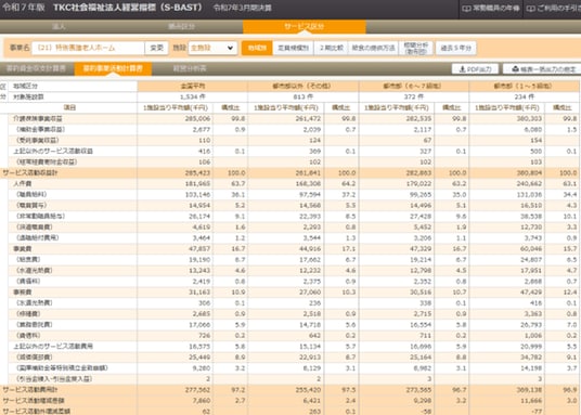 令和7年版S-BASTは令和6年度決算(令和7年3月)をTKC社会福祉法人会計システム(「TKC社会福祉法人会計データベース(平成23年基準版)」または「FX4クラウド(社会福祉法人会計用)」)を利用して行った2,829法人(うち、拠点区分数で7,272件、サービス区分数で14,779件)の経営成績と財政状態を分析したものです。