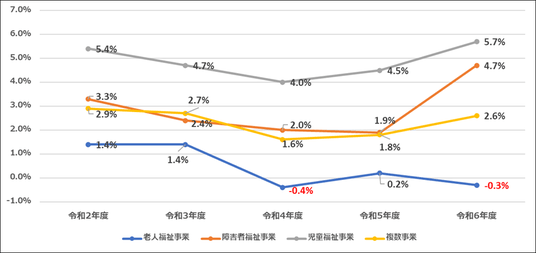 しかしながら、法人の実施している事業の内容別に見ると、老人福祉事業のみを実施している法人のサービス活動増減差額率は、前年から0.5ポイント悪化し、-0.3%となっており、事業によっては未だ厳しい状況が続いています。