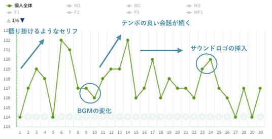 男性の『そんなに評価高いなら、、』と言うセリフと共に明るいBGMに切り変わり聴覚的な刺激を与えることで注視を維持。