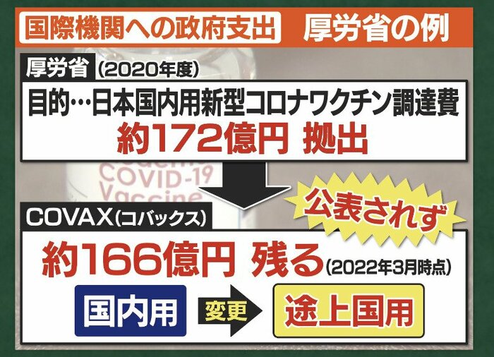 厚労省はコロナ禍の2020年、日本国内の新型コロナワクチンの調達費として約172億円を拠出しました。こちらCOVAX(コバックス)に拠出していたんですけれども、この約166億円が2022年の段階で残っていたということなんです。その後国内用から途上国用に用途が変更されており、これが公表されていませんでした。