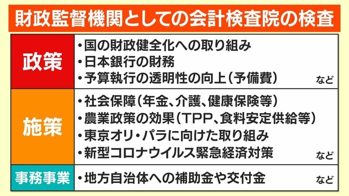 国費が入っているものは全て検査をするということが法律に定められていますので。そうなると防衛もやりますし、農業も見ますし、教育も見ます。