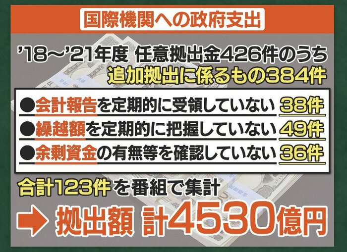 会計報告を定期的に受領していない38件。繰越額を定期的に把握していない49件。余剰資金の有無などを確認していない36件。合わせて123件を番組で集計したところ、拠出額は合わせて4530億円に上ることがわかりました。
