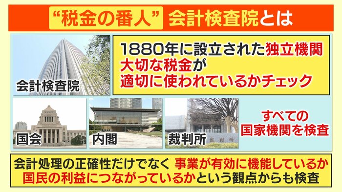 会計検査院は、国会や内閣、裁判所からも独立した立場で、国や政府関係機関のお金の出入りを厳しくチェックしています。もし不適切な会計処理を見つけた場合は、その都度、是正や改善を求める、いわば“税金の番人”です。