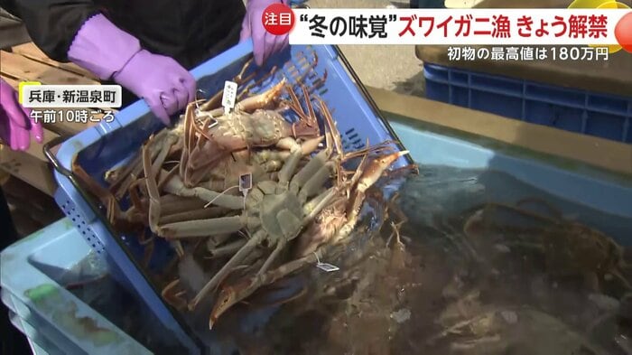 兵庫・新温泉町の浜坂漁港では午前10時すぎに漁を終えた船が戻り、ズワイガニが次々と水揚げされた。